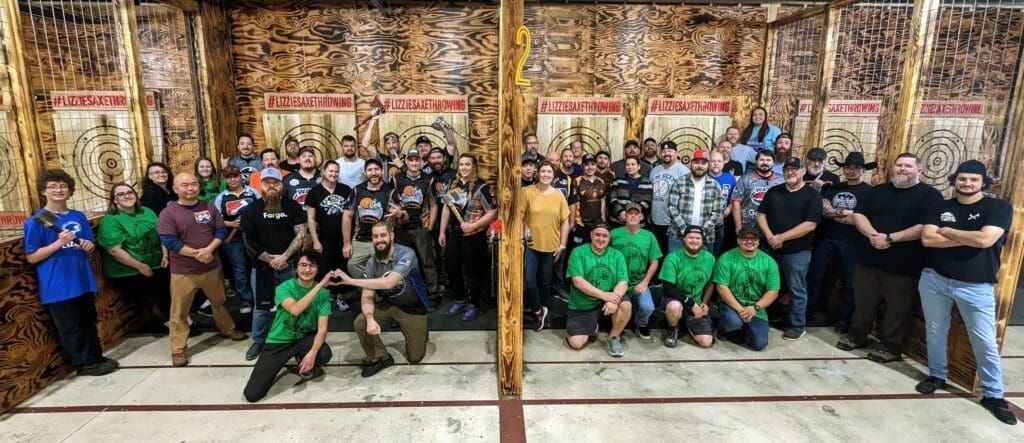 Throw alongside your partner? DUALS is perfect for you! Teams of 2 throwers compete by throwing their hatchets at the same target, at the same time. At. The. Same. Time.