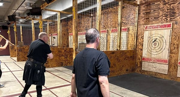 Whether you’re brand new to axe throwing or a seasoned thrower, Lizzie’s is the place for you. Our trained staff will teach you everything you need to have an exciting (and safe!) time. Lizzie’s Axe Throwing is a down-to-earth, upbeat throwing venue. You’re more than welcome to hang out and watch your friends throw, or just enjoy a drink while watching a game on one of our TVs. There no pressure to be a throwing ace— come have some fun!
